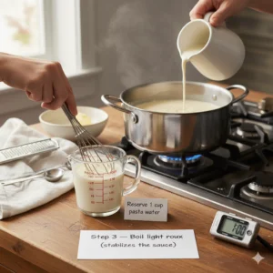 Bring salted water to a boil. Add pasta and cook until al dente. Reserve about ¼ cup (60 ml) of pasta water before draining. The reserved water helps coat the noodles and adds creamy texture without cream.